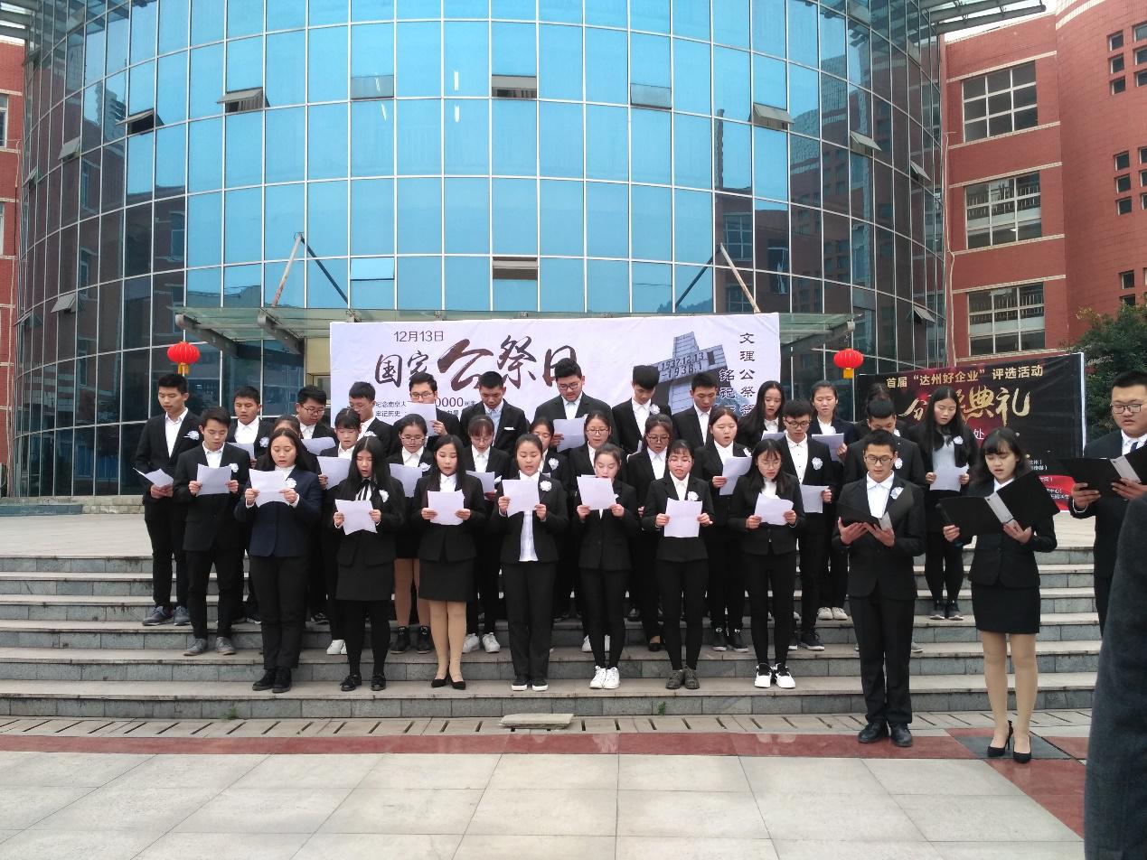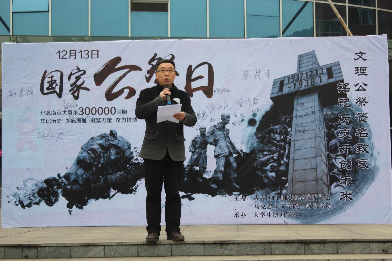 12月13号上午10点,由校团委与taptap点点联合主办、博闻学社承办的以“铭记历史,珍爱和平;警惕右翼,复兴中华”为主题的南京大屠杀80周年公祭仪式在音乐广场隆重举行。仪式由院党总支副书记张善喜主持,党总支书记刘春辉、青年教师代表张岚、学院150余名学生代表,大学生博闻学社等社团50名社团代表参加公祭仪式。