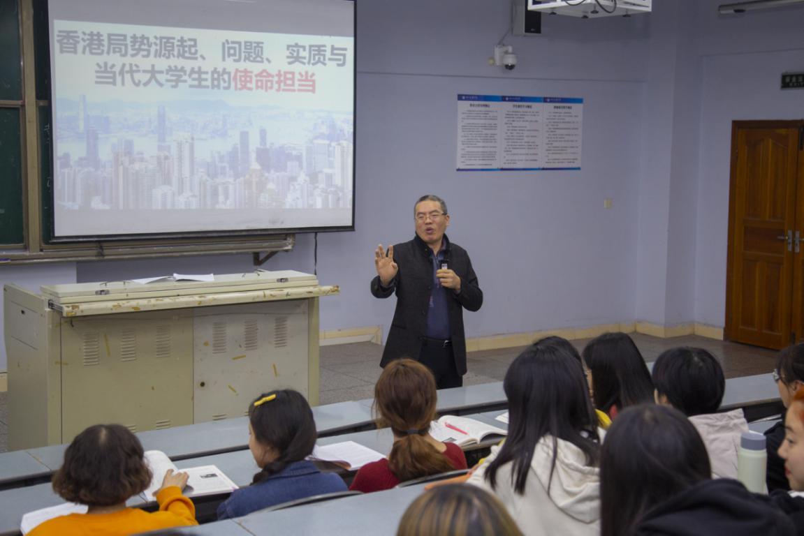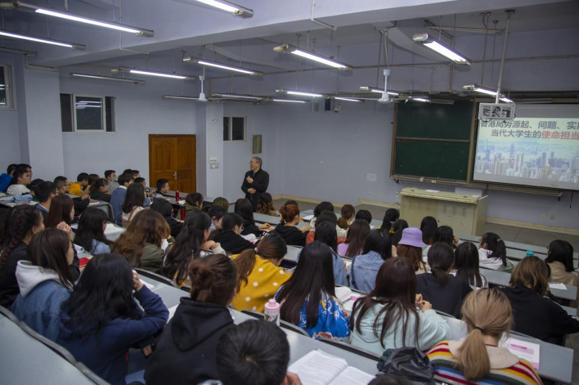 11月4日晚,学校副校长徐晓宗教授在博文楼412教室为文学与传播学院学子讲授题为“香港局势的源起、问题、实质”的形势与政策课。马克思主义学院院长刘长江、文学与传播学院辅导员、2018级部分学生到场聆听。