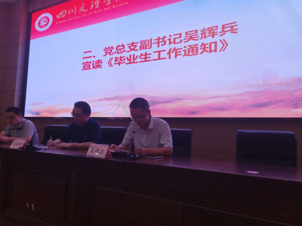 党总支副书记吴辉兵宣读《学院关于组建2019届毕业生毕业工作小组的通知》和《关于组建2019届“毕业生文明离校学党员(干部)服务队”的通知》,并对毕业生工作和离校工作等相关工作进行说明。