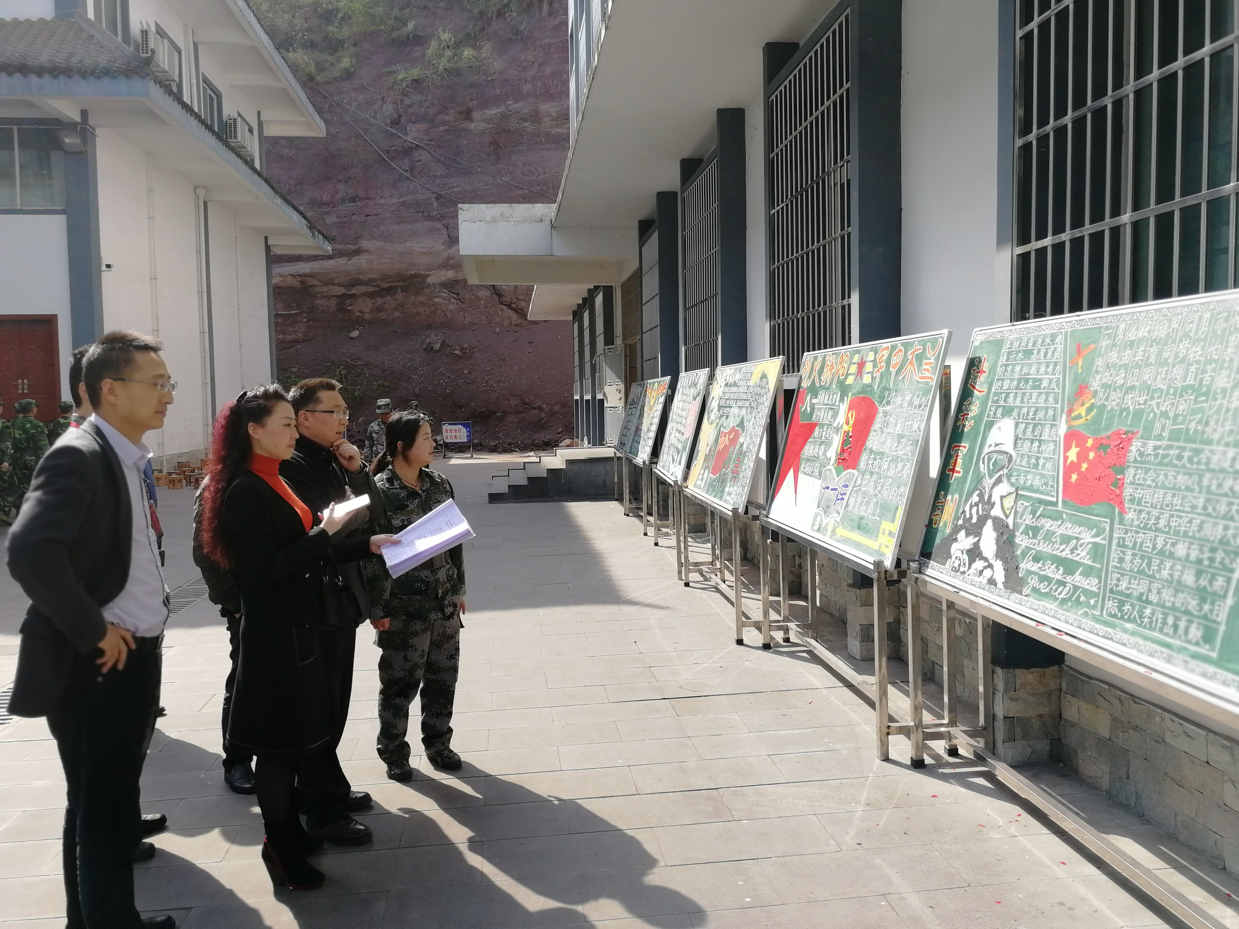 学院党政领导、老师在训练基地李洪副主任的带领下观看了同学们的警棍盾牌和队列等项目的操练,参观了同学们的军训主题展板、黑板报和宿舍内务整理情况,随行人员对同学们整齐威严的队列军姿、设计精美的板报展板和整齐美观的寝室内务给予了高度的评价。