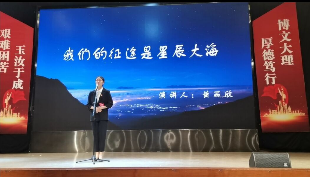 黄雨欣同学与来自学校其他二级学院的13位选手同场竞技,她以《我们的征途是星辰大海》为题,分享了中国天眼之父——南仁东从拒绝国外高薪回到祖国研究天眼FAST的先进事迹,生动形象展示出南仁东的爱国情怀,表达了青年大学生应以科学家为榜样,志存高远、勤奋学习、修身成才、报效祖国的人生之志。她用大方的仪表,优美的声音,激昂的语调,恰当的手势活跃了现场的气氛,引起评委和观众的强烈共鸣,比赛掌声不断,高潮迭起。
