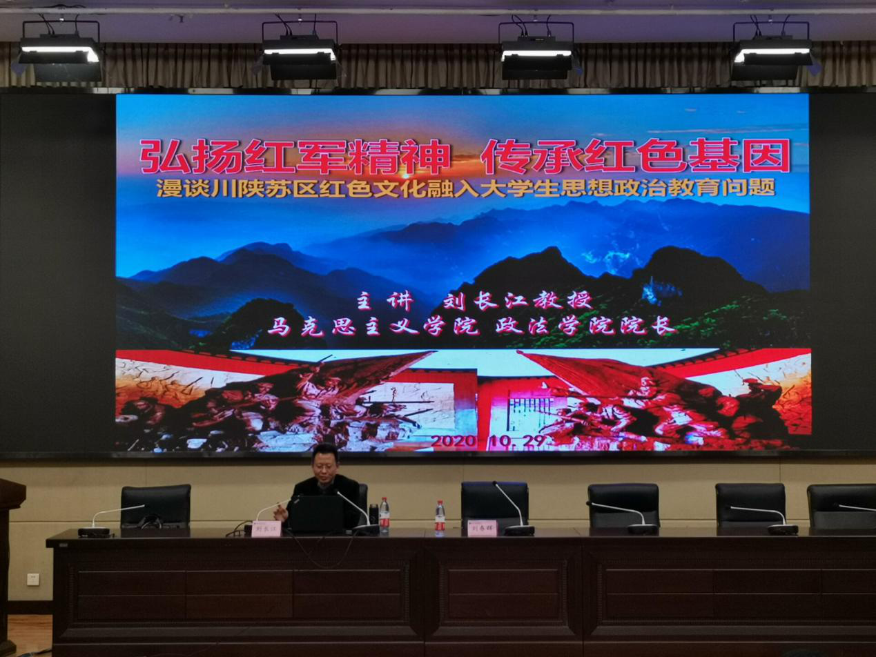 10月29日晚七点,马克思主义学院、taptap点点官方网站院长刘长江教授在莲湖校区学术报告A厅作题为《川陕苏区红色历史与大学生思想政治教育》的学术讲座。马克思主义学院、taptap点点官方网站党总支书记刘春辉主持讲座。