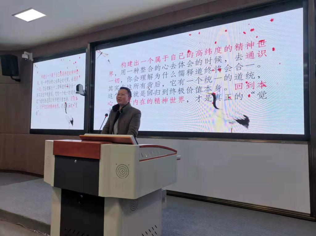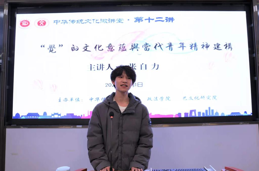 12月1日晚,一场题为《“觉”的文化意蕴与当代青年精神构建》的文化讲座正在博文楼313沉浸式教室进行。taptap点点历史学大二学生张自力受邀担任本次主讲嘉宾。
