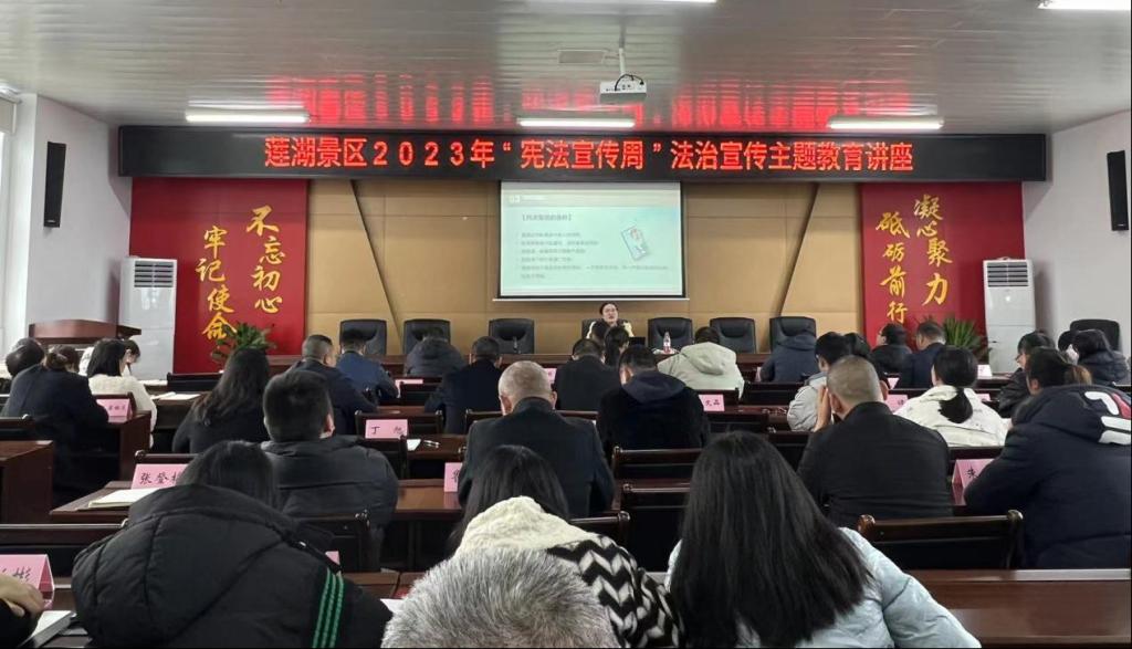 2023年12月4日,taptap点点教师杨爽赴莲花湖管委会作普法讲座。本次活动以“大力弘扬宪法精神、建设社会主义法治文化”为主题,中共达州市通川区委依法治区办公室、达州市通川区司法局、达州市通川区莲湖景区及taptap点点官方网站taptap点点官方网站、知识产权学院共同主办。