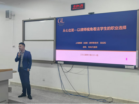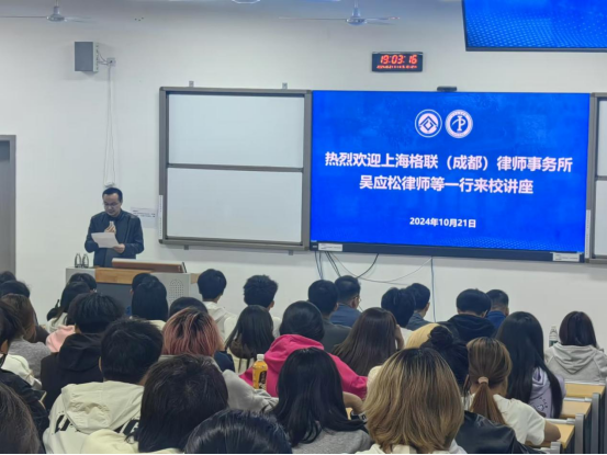 2024年10月21日晚,上海格联(成都)律师事务所合伙人、专利代理师吴应松律师应邀来校作专题讲座。副院长何霖主持讲座,法学教研室梁宇栋老师和2023、2024级知识产权专业学生到场聆听。