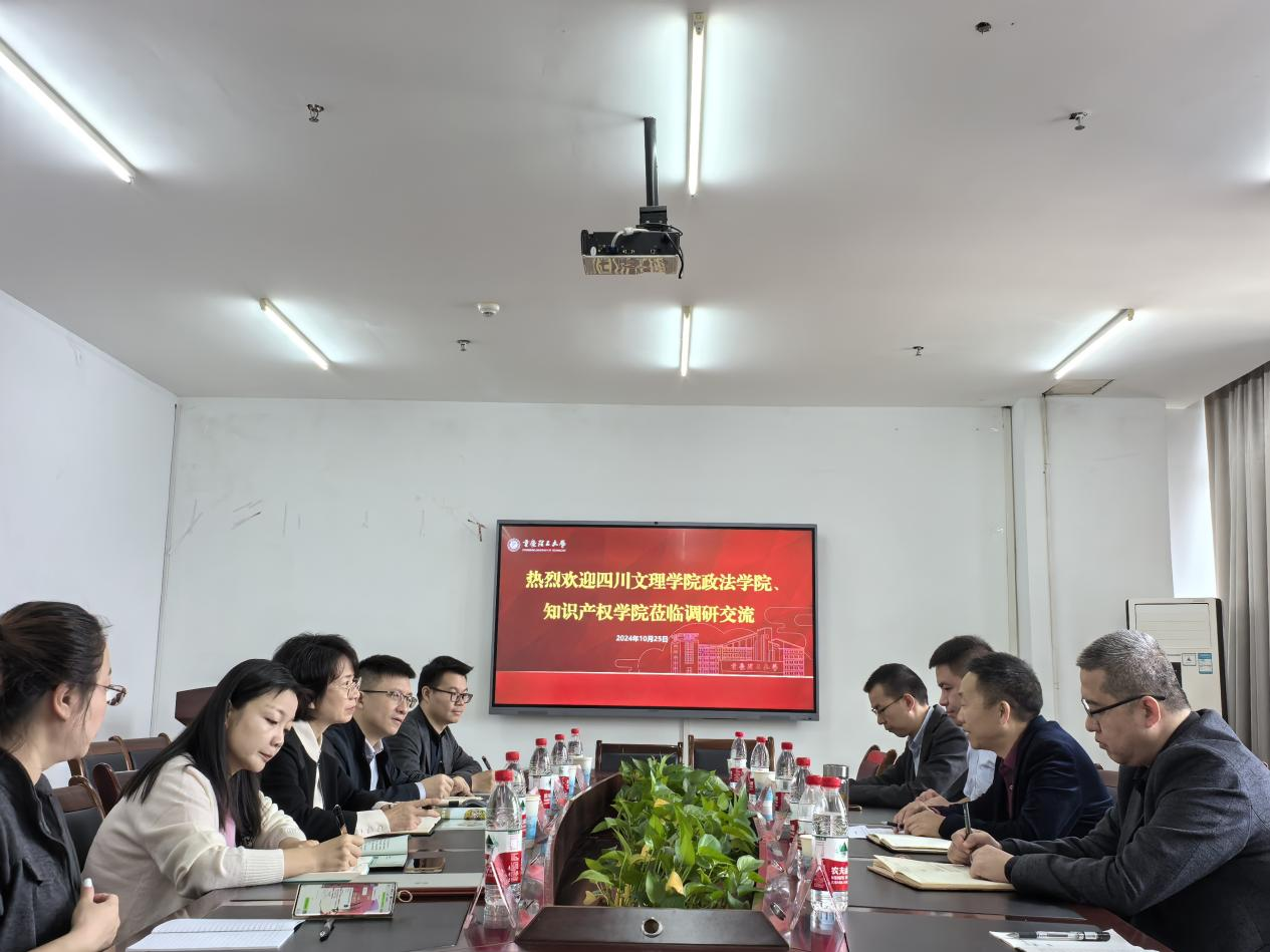 2024年10月25日,学院党委书记岳臣忠与法学教研室部分教师一行赴重庆理工大学知识产权学院调研、交流。重庆理工大学知识产权学院党委书记符旭涛、副院长黄光辉、范小渝博士、祝艳艳博士、李安琪博士参加座谈交流。