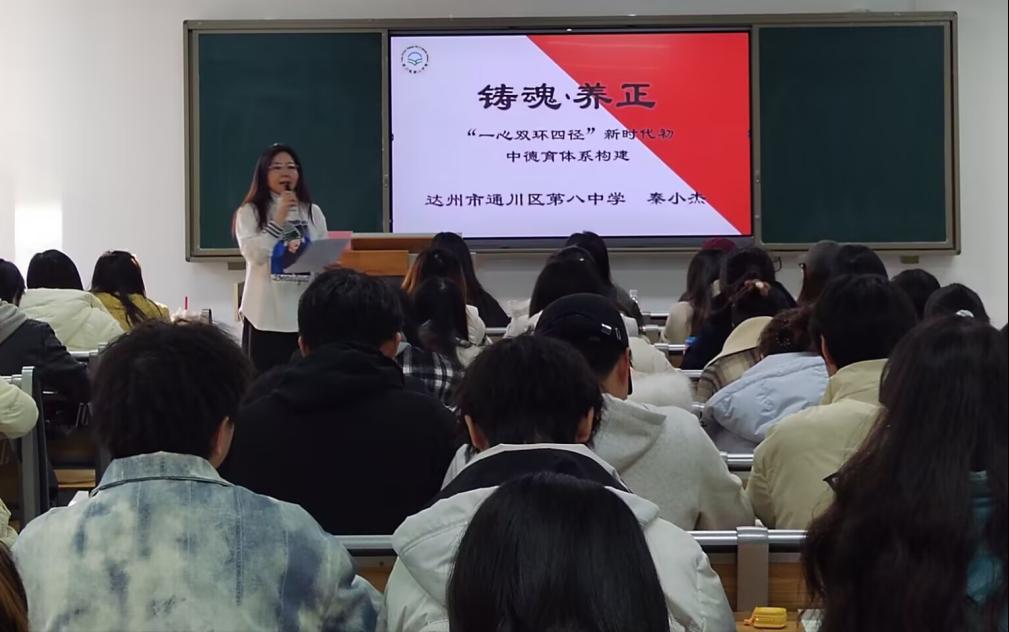 秦校长结合通川区八中的德育实践,给同学们详细阐释了中学德育体系的构建:一是围绕“一心”核心,锚定育德方向。以“铸魂·养正”为德育核心理念,明确育人根本目标,通过体系解读让师生明晰德育的思想引领价值,营造以“魂”立人、以“正”养人的育人氛围。二是构建“双环”资源矩阵,内环融合德智体美劳五育,打造校内全学科育人场;外环联动家校社力量,形成共育合力,实现德育从“校内单一维度”向“内外协同全域”延伸。三是落地“四径”实践路径,以队团组织教育、心理健康教育、法制安全教育、行为习惯养成教育为具体抓手,将“铸魂·养正”的核心目标转化为可操作的日常育人举措,让师生对德育实施有了更清晰的落地思路。