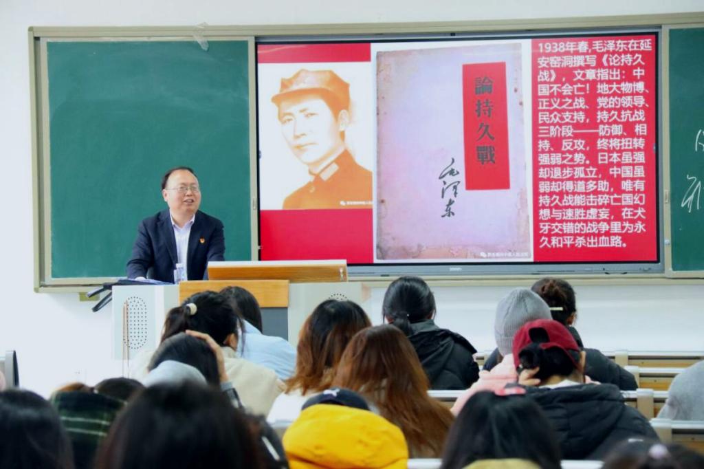 讲座以抗日战争关键历程为开篇,重点解析《论持久战》与百团大战两大标志性事件。围绕《论持久战》,张老师阐释了抗战防御、相持、反攻三阶段战略部署,深入剖析日本侵略者退步孤立的本质,点明中国人民坚持持久战的必胜底气。讲座深入后,他通过介绍习近平总书记从基层成长的奋斗历程及习仲勋同志的革命事迹,展现革命精神的代代传承;又讲述杨靖宇、赵一曼、左权等先烈事迹,让学生深刻领会抗战精神中“天下兴亡、匹夫有责”的爱国情怀等丰富内涵。此外,他强调抗战歌曲的精神引领作用,与同学们共唱《义勇军进行曲》《黄河大合唱》《毕业歌》等歌曲,并结合“两弹一星”等新时代精神,鼓励大学生坚定理想、刻苦钻研、开拓创新、艰苦奋斗,将抗战精神融入日常。