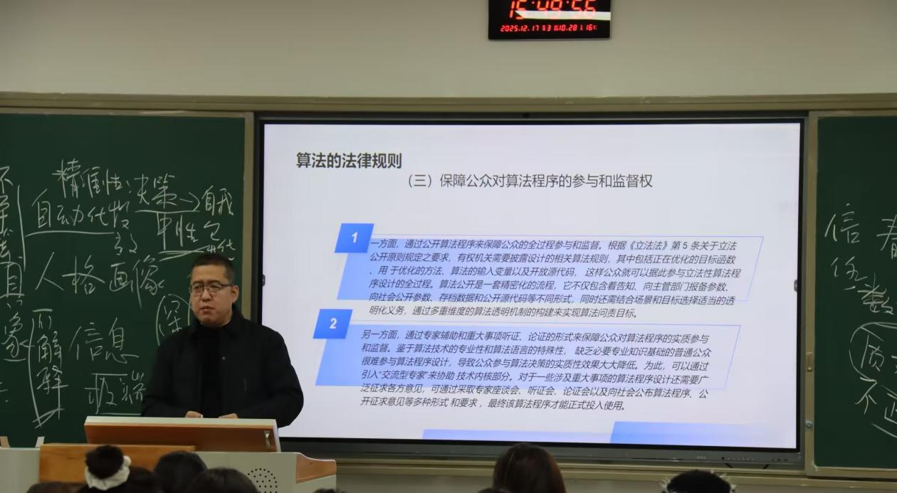 为提升知识产权专业学生对前沿法律问题的认知,深化对算法治理与法律规制的理解,12月6日,法学教研室主任梁宇栋老师开展“公共性算法及其法律规制”专题讲座,知识产权专业学生齐聚课堂,共同聆听这场兼具理论深度与实践价值的分享。