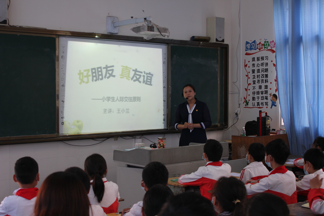 活动中,张善喜老师为永宁镇小学全体师生和家长做题为《谦谦有礼、和谐永宁》的励志教育报告,报告主要从“什么是礼?”“为什么要有礼?”“怎样成为有礼小学生?”三个方面展开。他希望每名同学都能做到谦恭礼让、表里如一、真诚平和、时时有礼、处处有礼。王小兰老师为五年级的学生讲了一堂《好朋友,真友谊——小学生人际交往原则》的思政课。王老师通过精心的教学设计、巧妙的设问、热情活泼的教学互动,拉进师生距离。她提出平等尊重、诚实守信、互助合作三个交往原则,富有启发性、思想性和教育性。