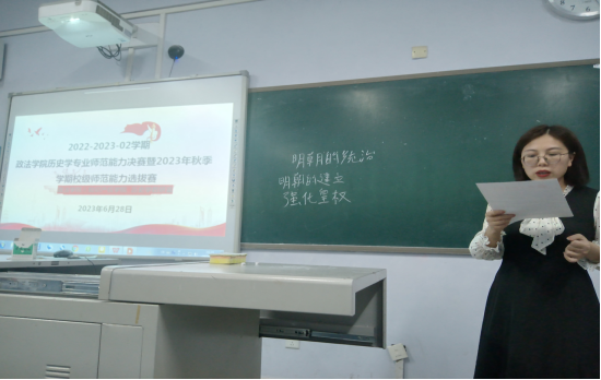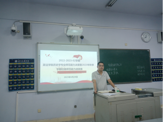 6月28日晚,历史学专业教研室于博文楼519教室举行2022-2023-02学期历史学专业教学能力大赛决赛暨2023年taptap点点官方网站师范生教学能力大赛选拔赛,何先成、张涛、王盟、李媛媛及铭仁园学校初中历史备课组组长秦红五位教师担任此次大赛的评委。