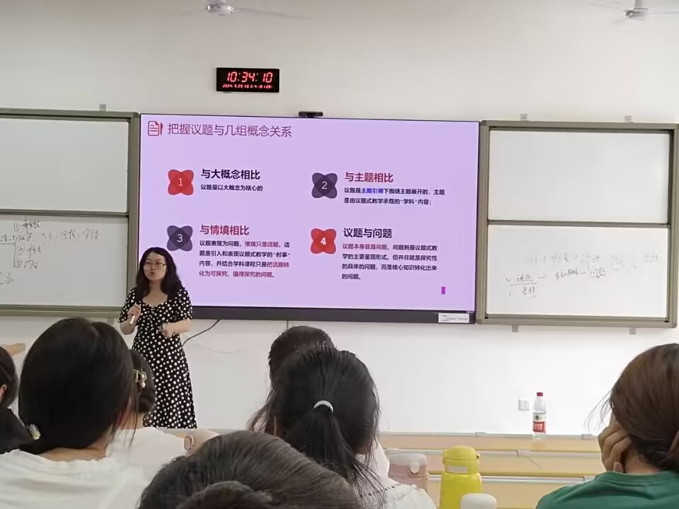 首先,王莉老师提到高中思想政治课提倡采用议题式教学,这就需要思政专业学生深入学习和掌握这一教学方法,为今后的教学活动奠定基础。王老师从议题式教学的含义、特征等方面给同学们深入讲解,并以一线教师精心设计的多个教学PPT为例,向同学们全方位地阐释了一个合格的“议题式教学”PPT的制作需要包含的多个要素。她强调议题式教学要坚持“一案到底”,让学生深入学习理论知识,将理论与实践联系起来。