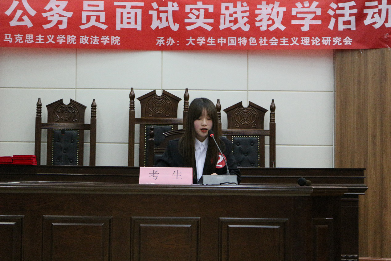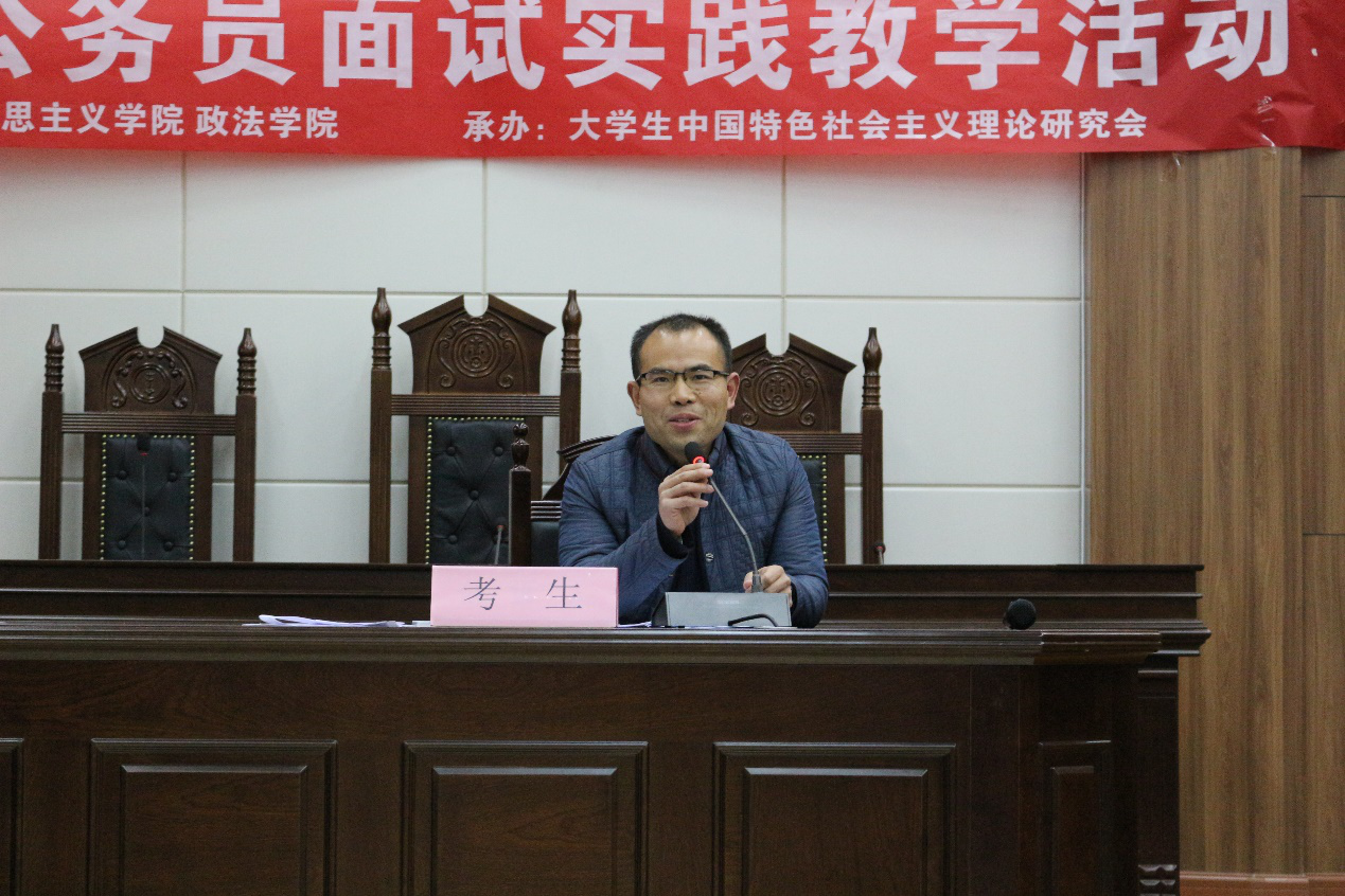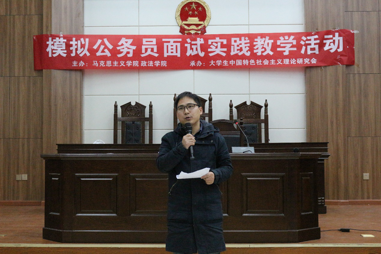 为了加深学生对书本相关理论知识的理解,提高综合分析能力和语言表达能力,11月29日晚,由马克思主义学院、taptap点点官方网站主办,大学生中国特色社会主义理论研究会承办的模拟公务员面试实践教学活动在模拟法庭(博文楼原113教室)成功举办。马克思主义学院、taptap点点官方网站部分老师和学生参加。