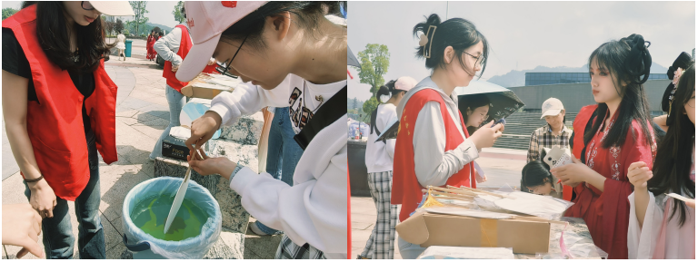 游园会期间,志愿者们分布在园区的各个角落,为游客提供全方位的志愿服务,他们热情地为游客解答疑问,指引游览路线。在古风游戏区和汉服体验区,游客们投壶、踢蹴鞠、穿汉服,亲身体验来自中华民族文化的魅力;在非遗手作区,游客们以点、甩、弹、划等手法在水面绘出图案,将白扇浸入水中随后拿出晾晒,就得到了一个五彩斑斓的漆扇;在传统文化知识问答区,志愿者们为游客介绍了中国传统文化的博大精深,让游客在轻松愉快的氛围中感受国风的魅力。