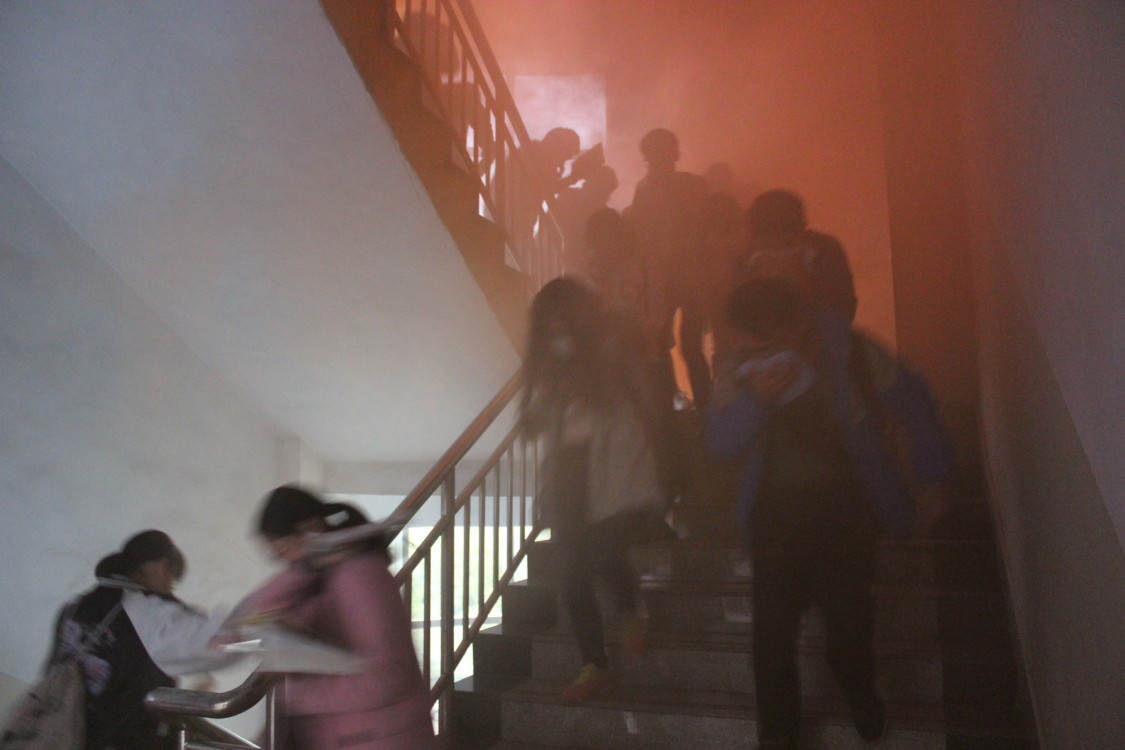 随警报声的响起,各班班长立即到达指定位置,确保演练过程的安全,认真协助,并指导同学们有序快速疏散;同学们立即从座位上起立,快速有序的奔向走廊;同学们根据应急预案中规定的路线,弯着腰、猫着步,用手帕、毛巾等捂住口鼻,沿着指定楼梯口快速前进,有序撤离到一教楼正门口的安全地带,随即各班班长清点人数,并层层向上汇报,演练共用时57秒,全体同学安全疏散,整个过程紧张有序、实用性强,达到了预期效果。