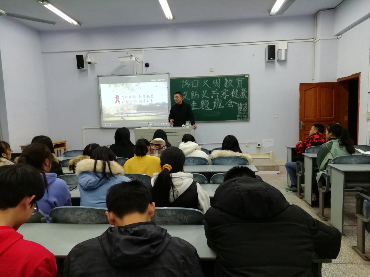 各班的辅导员通过关于艾滋病的视频直观地向大家展示艾滋病的感染过程以及危害,并向同学们讲解艾滋病的概念、传播途径、防护措施。辅导员以提问、互动等方式检测同学们对艾滋病相关知识的掌握情况,同学们积极回应,踊跃发言,表达了自己对艾滋病的认识和看法。辅导员要求学生不歧视艾滋病人,要关爱艾滋病人,同时,要自尊自爱,学会自我保护,远离毒品,避免感染艾滋病毒。