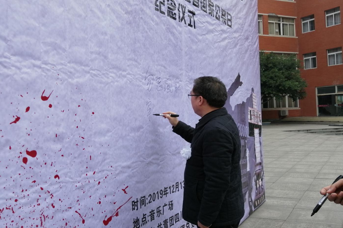 仪式活动中,全体师生默哀三分钟,表达了对‘南京大屠杀’死难者的无限哀思。2019级1班陈双龙同学作《声声警鸣,驶向和平》愤慨激昂的演讲,表达了对侵略者的控诉、对死难者的缅怀及对和平的珍爱。2019级2班的同学们饱含深情地朗诵《和平宣言》,表达了同学们铭记历史、珍爱和平的愿望,砥砺奋进成长成才,报效祖国的决心。老师们和同学们纷纷上前在纪念南京大屠杀死难者国家公祭日展板上签名、写寄语。