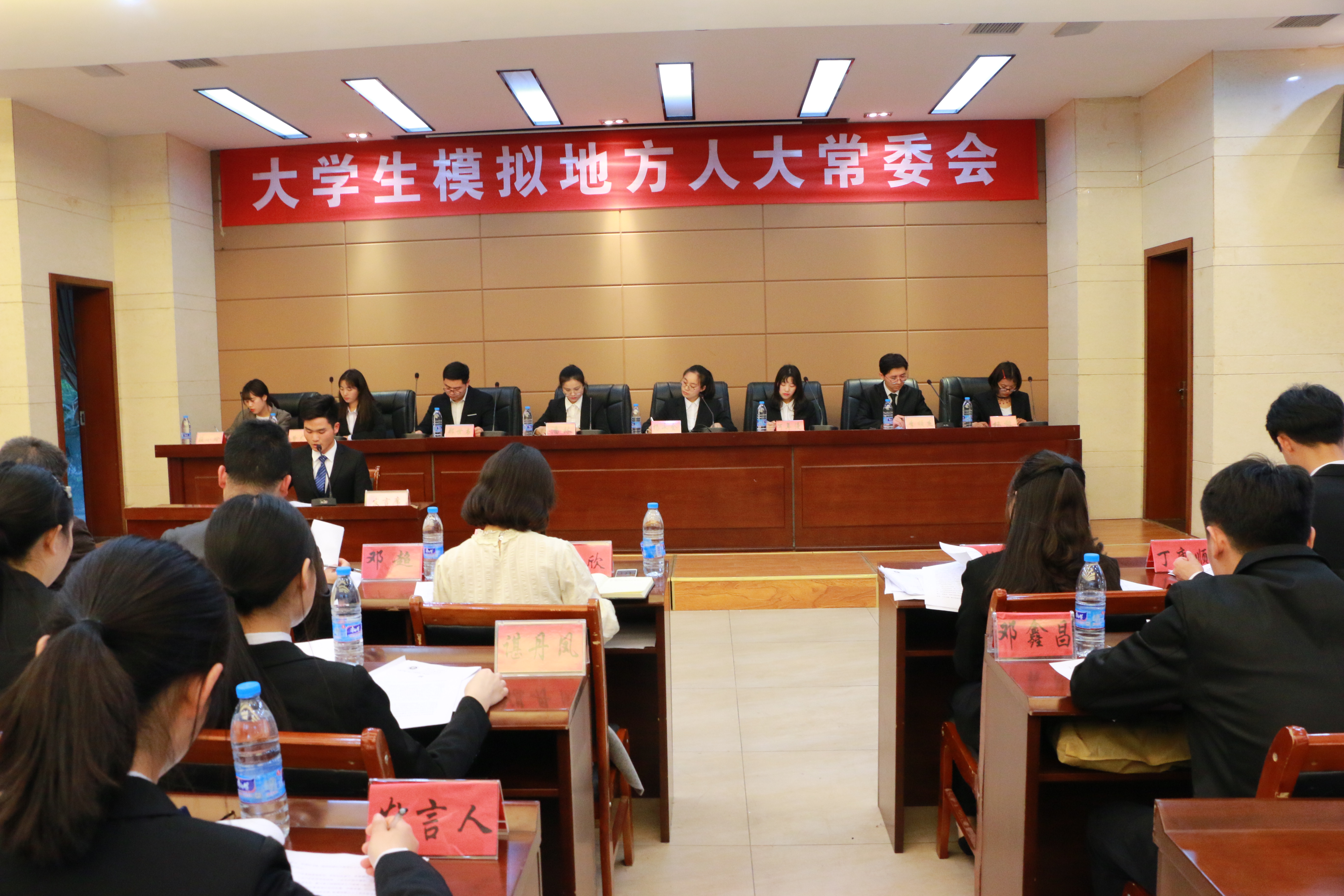 本次活动模拟了凤凰市人大常委会会议的全过程,第一次全体会议中,由模拟“凤凰市人大常委会主任”的同学主持会议,同时,由四位同学分别模拟“市长”、“副市长”、“市环保局局长”和“人大常委会副主任”作专项政府报告以及关于人事任免有关情况的说明。分组审议中,由模拟“主任”的同学主持会议,20余名“委员”围绕以凤凰市人民政府关于建设“东出北上”现代综合交通枢纽情况、“聚焦转变产业发展思路”和“凤凰市周边环境及污染问题”的专项政府报告以及“人事任免情况”作出详尽审议。第二次全体会议中,由模拟“凤凰市人大常委会主任”的同学主持会议,在所有在场人员目睹下,各“委员”通过无记名投票方式对人事任免进行表决。