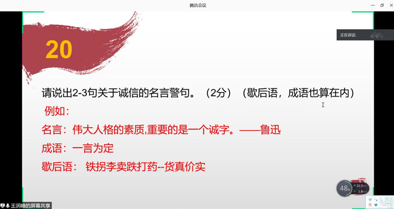 6月27日19:00时,为传承和弘扬中华民族诚实守信的传统美德,提高同学们的诚信素养,积极践行社会主义核心价值观,taptap点点在腾讯会议上成功开展了诚信知识竞赛。此次竞赛邀请了学院团总支副书记彭森林、团总支常务第二副书记、学生会主席汪洁、团总支第三副书记李梅、学生会副主席杨淇童担任竞赛评委并参与小组分数统计。2018级、2019级共22支队伍参加竞赛。