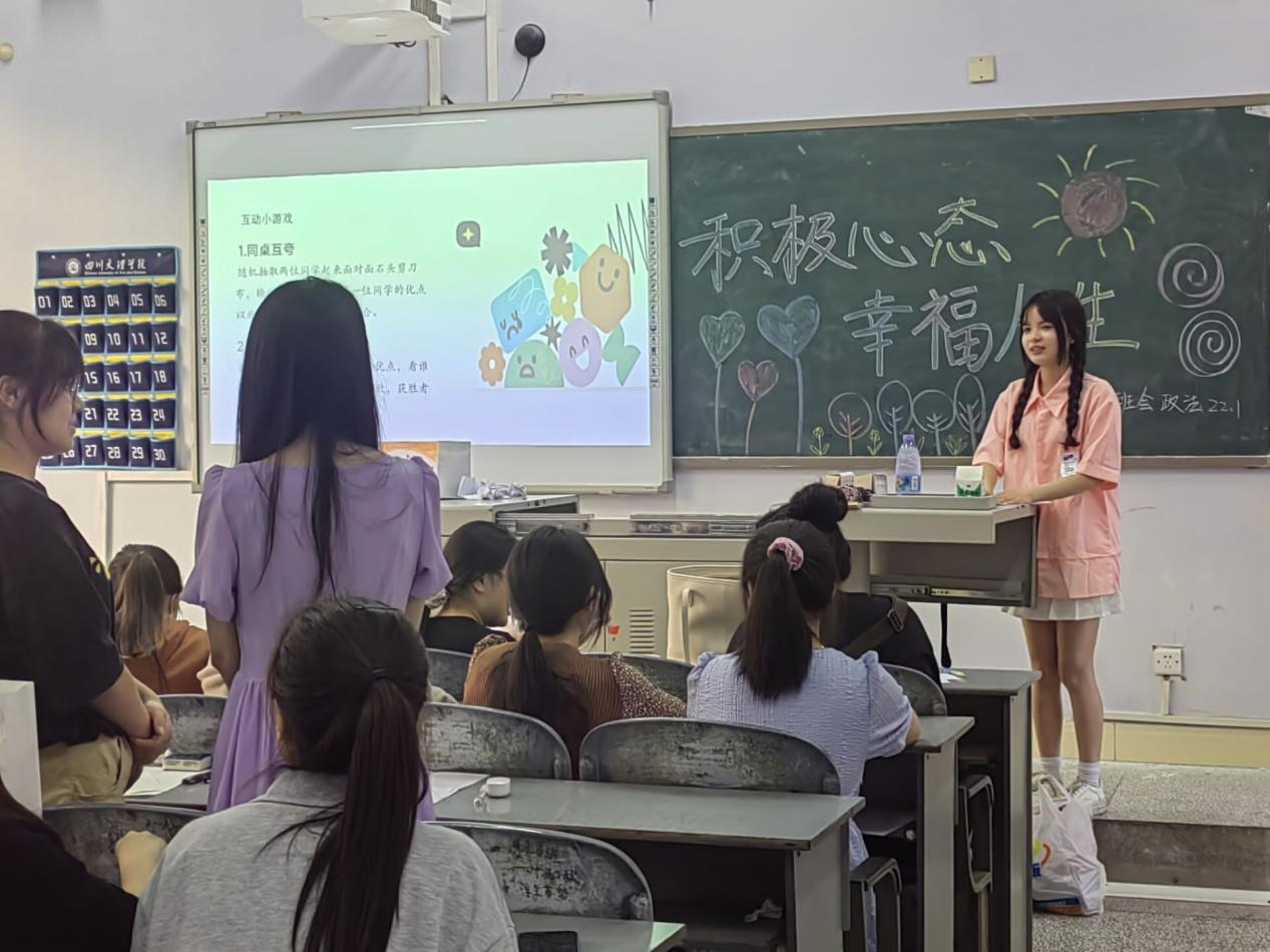 5月28日,各班开展以“积极心态,幸福人生”为主题的心理班会。各班通过PPT向大家讲解了调节情绪、管理情绪的理论方法,期间设置了“幸福健康操”“匿名吐槽”等形式多样的互动环节,以缓解同学们的压力。班会坚持理论联系实际,引导同学们感受生活中的爱与幸福,以更积极、更自信的心态面对人生和未来。
