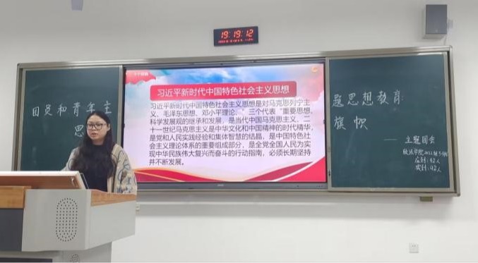 团会开始,全班同学起立齐唱团歌,加强了同学们团员意识教育,团支书带领团员、青年领学习习近平新时代中国特色社会主义思想的核心要义,重点围绕“两个结合”、“六个必须坚持”、“十个明确”、“十四个坚持”、“十三个方面成就”等方面的内容,增强对党的创新理论的政治认同、思想认同、理论认同、情感认同。