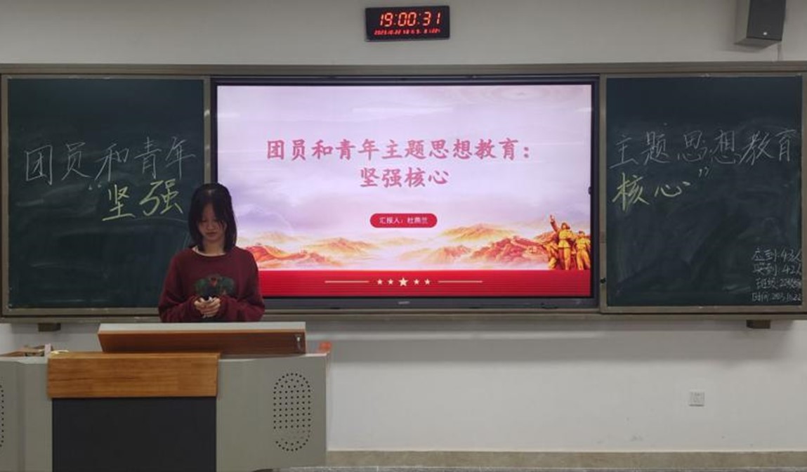 团会中,团支书照例组织全体同学齐唱中国共青团团歌,加强同学们的团员意识教育。歌毕,在团支书的带领下,全体团员认真学习感悟了在以习近平同志为核心的党中央坚强领导下、在习近平新时代中国特色社会主义思想科学指引下,新时代党和国家事业取得的历史性成就,发生的历史性变革,并引领团员深刻领悟“两个确立”的决定性意义,增强“四个意识”、坚定“四个自信”,做到“两个维护”,自觉在思想上政治上行动上同以习近平同志为核心的党中央保持高度一致。