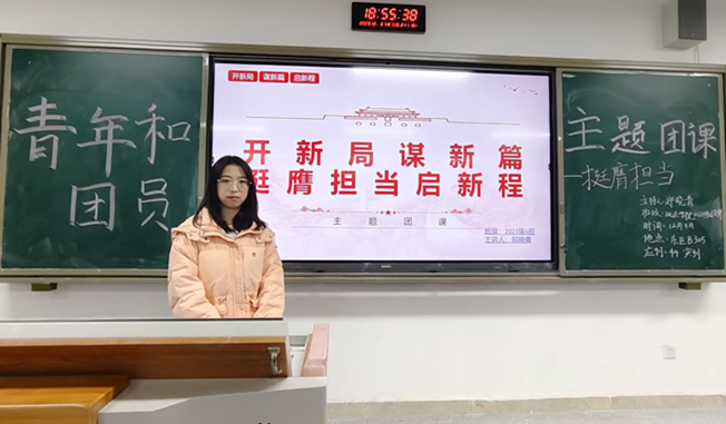 团会伊始,团支书带领全体同学齐唱中国共青团团歌,同学们以饱满热情歌唱,唱出了对团的热爱,彰显了青春活力与朝气。会中,各团支部带领大家认真学习了习近平总书记关于党的青年工作的重要论述,深刻感悟习近平总书记对青年工作的重要指示要求,要求大家牢记习近平总书记的嘱托,坚定信仰,在传承红色血脉中成长;真抓实干,在赓续奋进使命中成长;志存高远,在厚植为民情怀中成长。紧接着,各团支部观看“挺膺担当砺青春”视频,了解团十九大代表的风采故事,并以他们的先进事迹为学习榜样,汲取奋斗力量。