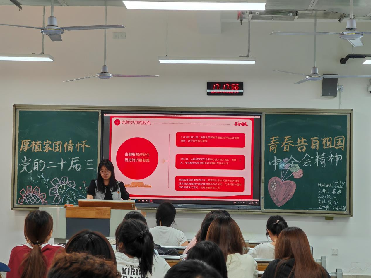 团会伊始,全体成员起立共唱共青团团歌,热情的精神面貌展现出昂扬的青春活力。各班团支书以新中国成立75周年为契机,组织团员学习党史、新中国史、改革开放史、社会主义发展史、中华民族发展史。讲解七十五年里我国在国防、教育、农业、科技、工程等方面的进步。并强调,广大团员和青年心中要深植家国情怀。同学们将怀揣着坚定的理想信念,自觉为强国建设、民族复兴伟业挺膺担当。