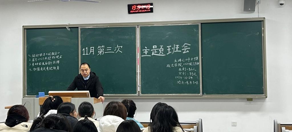 各班还就近期重点工作进行了部署安排:一是组织各班积极筹备2025年迎新晚会,提醒排练节目时注意安全;二是关注考研学生复习情况,提醒他们加强备考,缓解学习压力,做到劳逸结合,冲刺考研最后一公里;三是加强考风考纪教育,教育学生努力复习,诚信应考;四是结合近期社会公共安全事件,向学生普及公共安全知识,提升学生公共安全意识,共建平安和谐校园;五是学习师范专业认证应知应会知识,提高学生学习自觉性和主动性,确保以优良学风迎接历史学师范专业认证。