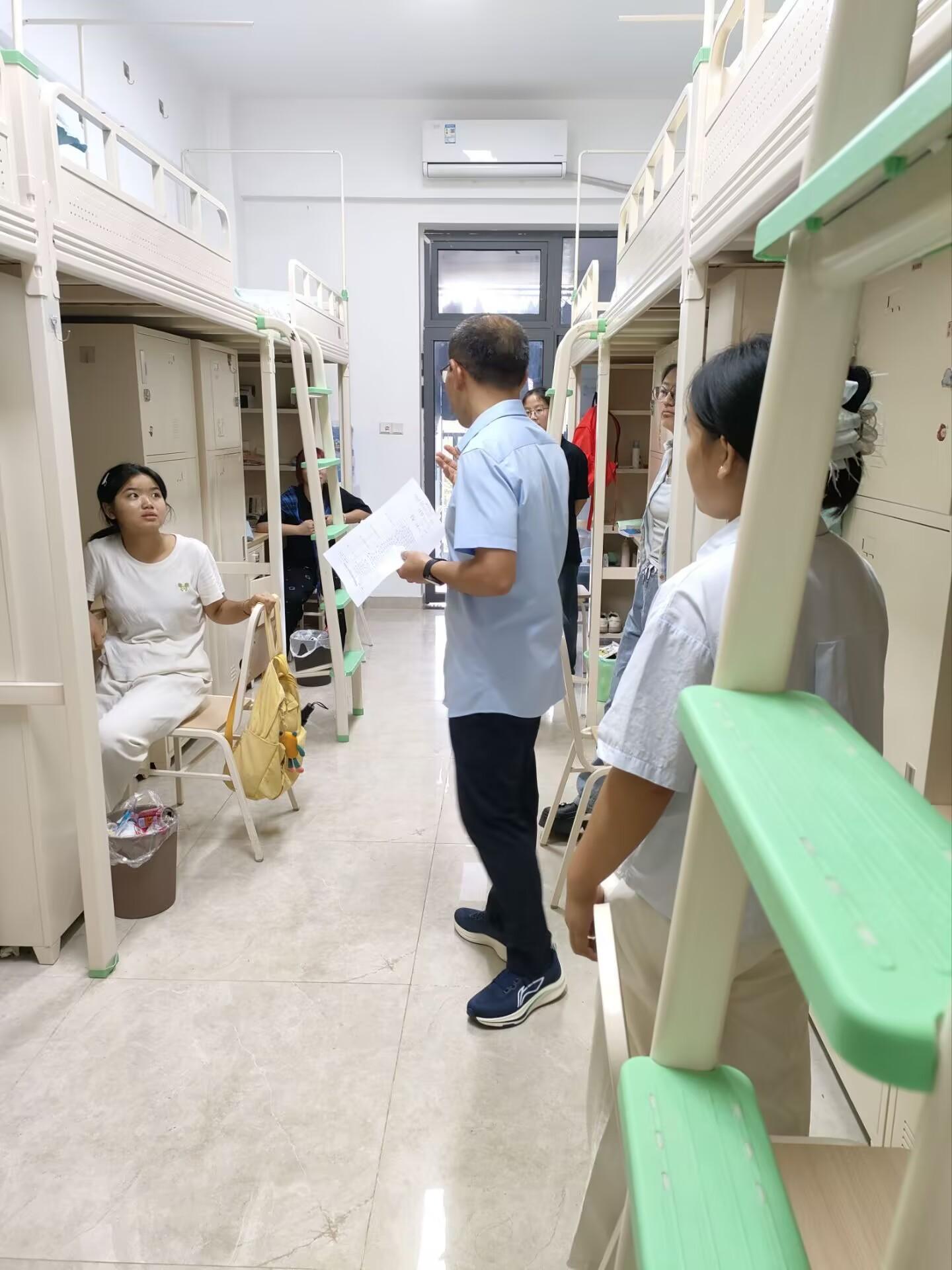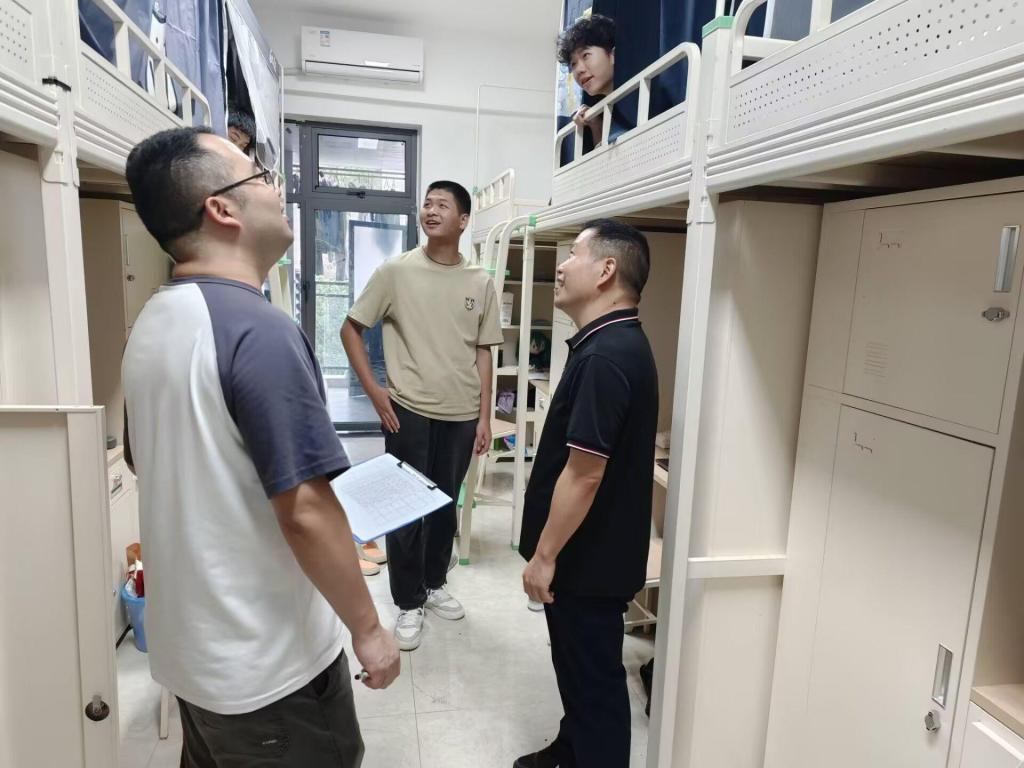 9月11日下午,学院党政领导班子带队,学工办全体人员随行,深入新生宿舍走访慰问刚完成入住安顿的2025级新同学。每走进一间寝室,领导们都笑意盈盈地与新生及陪同家长拉起家常:“老家是哪个省份的呀?”“食堂的饭菜还合口味吗?”“收拾行李、整理床铺时,有没有需要帮忙的地方?”一句句亲切问询,既细致了解大家的入住落实情况、对校园环境的适应程度,也耐心倾听大家初入校园的需求与建议。