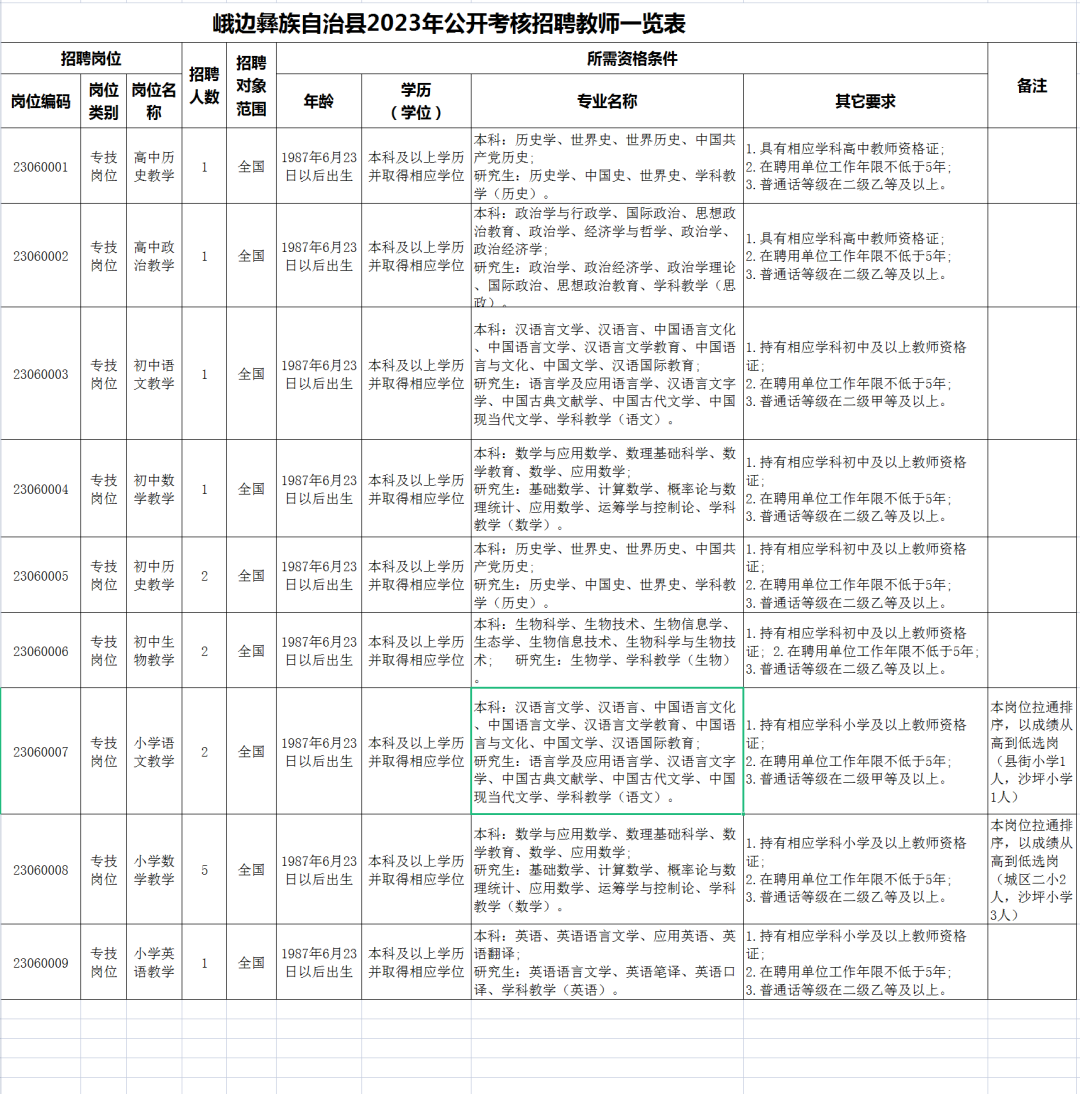 符合《峨边彝族自治县2023年公开考核招聘教师一览表》(详见附件1,以下简称《一览表》)中所需资格条件的2023年高校应届毕业生和社会在职、非在职人员。其中:2023年以前毕业的人员须在资格审查时提供岗位要求的毕业证、学位证等相关证书;2023年高校应届毕业生须在2023年7月31日前取得岗位要求的毕业证、学位证等相关证书;未在规定时间内取得并提供相关证书及证明材料的,不予聘用或不予进入下一招聘环节。