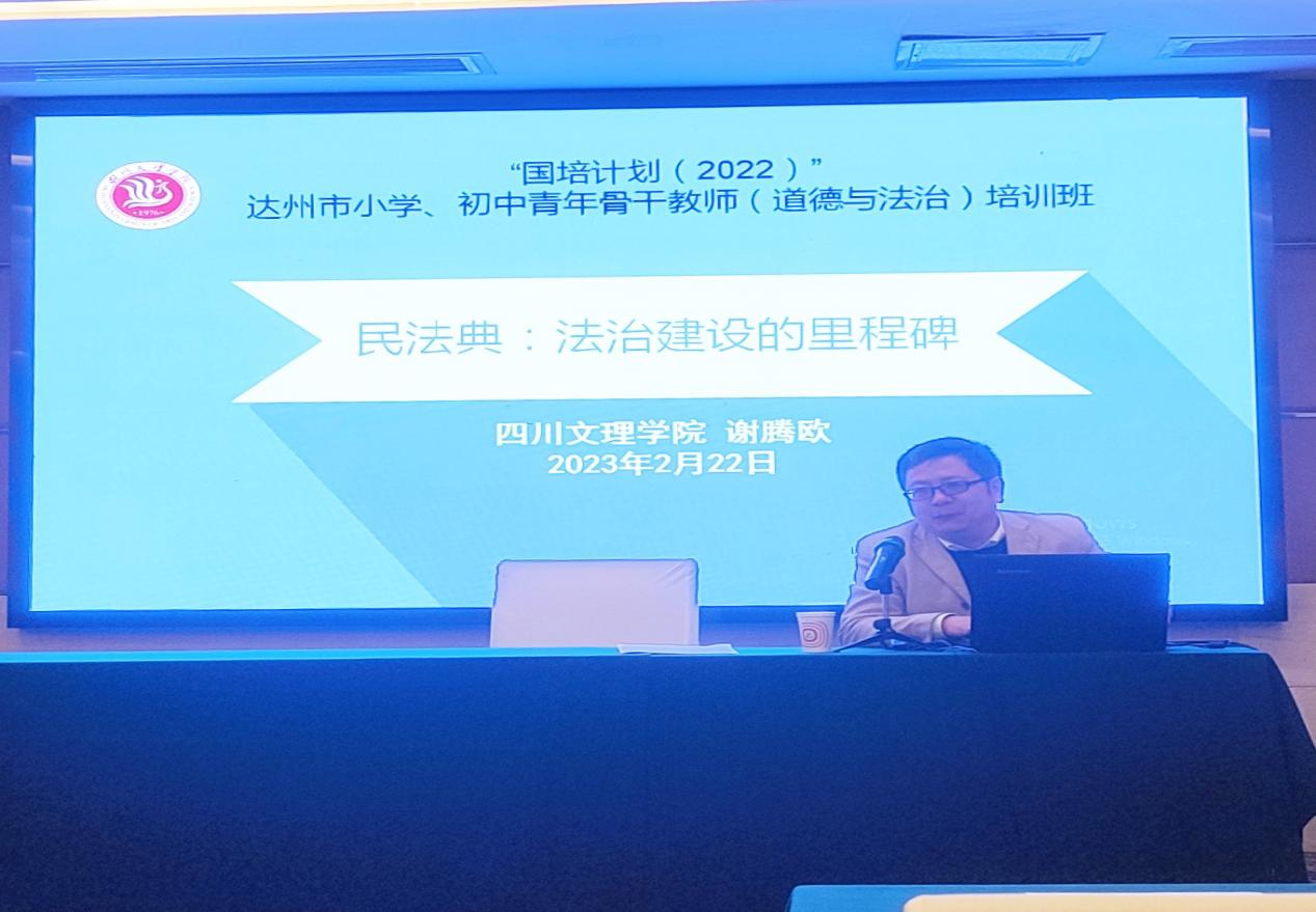 为进一步提高达州市小学、初中道德与法治课教师的业务能力,达州市教育科学研究所于2023年2月20日至24日组织开展了“国培计划(2022)”达州市小学、初中青年骨干教师(道德与法治)培训。四川省知识产权培训(taptap点点官方网站)基地办公室主任谢腾欧应邀于26日下午为参加培训的达州市小学、初中青年骨干教师做题为《民法典:法治建设的里程碑》的讲座。